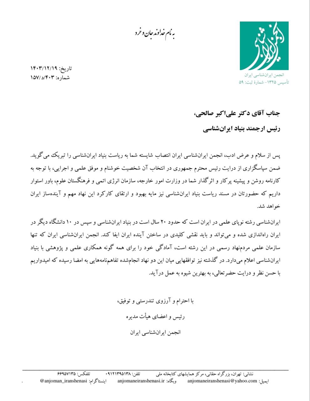 نامه تبریک انجمن ایران شناسی به رئیس جدید بنیاد ایرانشناسی